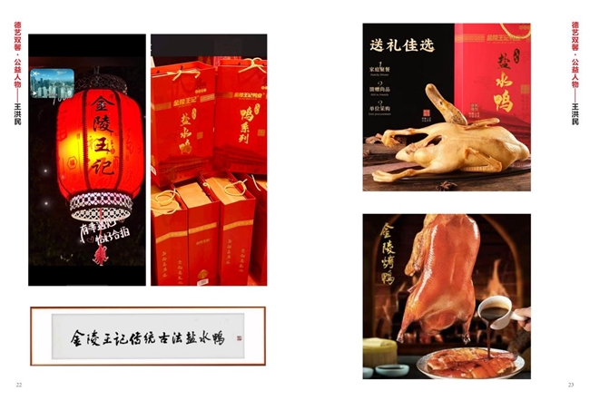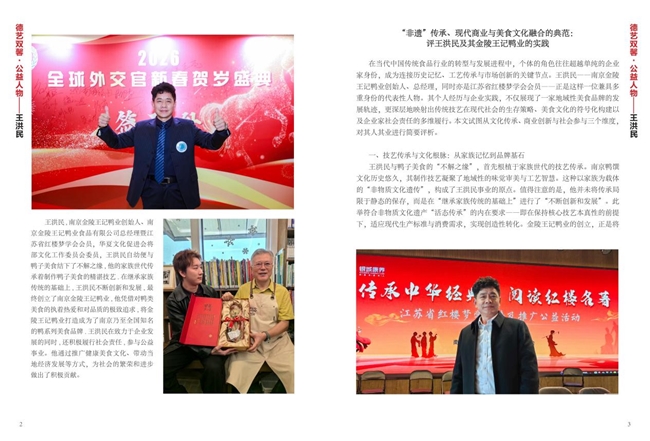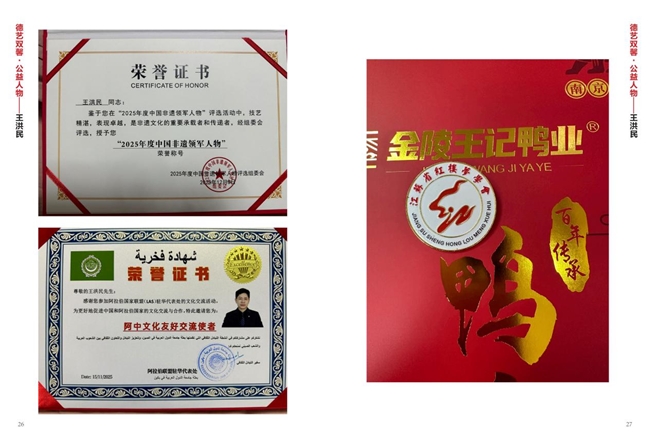 王洪民 , 南京金陵王记鸭业创始人、南京金陵王记鸭业食品有限公司总经理暨江苏省红楼梦学会会员,华夏文化促进会将部文化工作委员会委员,王洪民自幼便与鸭子美食结下了不解之缘 , 他的家族世代传承着制作鸭子美食的精湛技艺 . 在继承家族传统的基础上 , 王洪民不断创新和发展 , 最终创立了南京金陵王记鸭业 , 他凭借对鸭类美食的执着热爱和对品质的极致追求 , 将金陵王记鸭业打造成为了南京乃至全国知名的鸭系列美食品牌 . 王洪民在致力于企业发展的同时 , 还积极履行社会责任 , 参与公益事业。他通过推广健康美食文化、带动当地经济发展等方式,为社会的繁荣和进步做出了积极贡献。